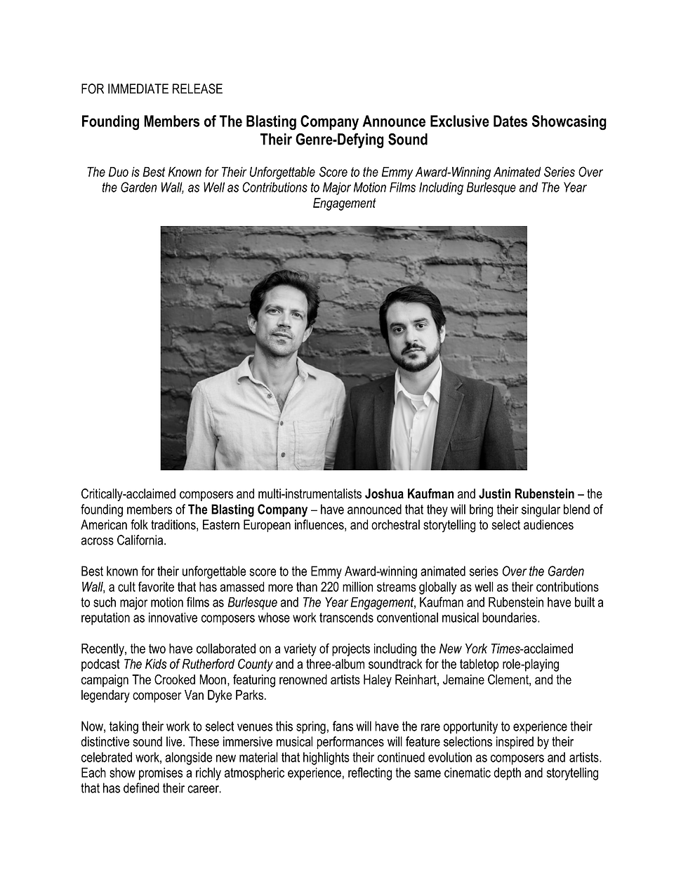 Press Release - The Blasting Company 2026 Tour